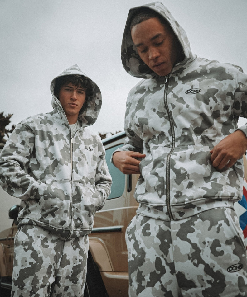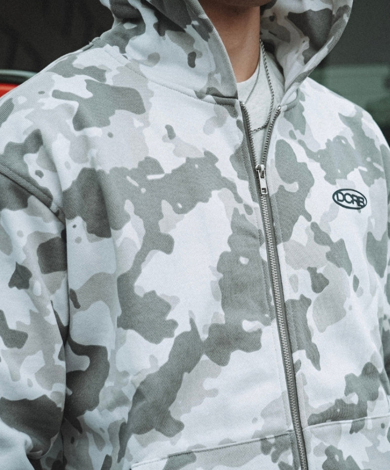Oversized French‑terry zip‑up delivers rugged camo warmth.