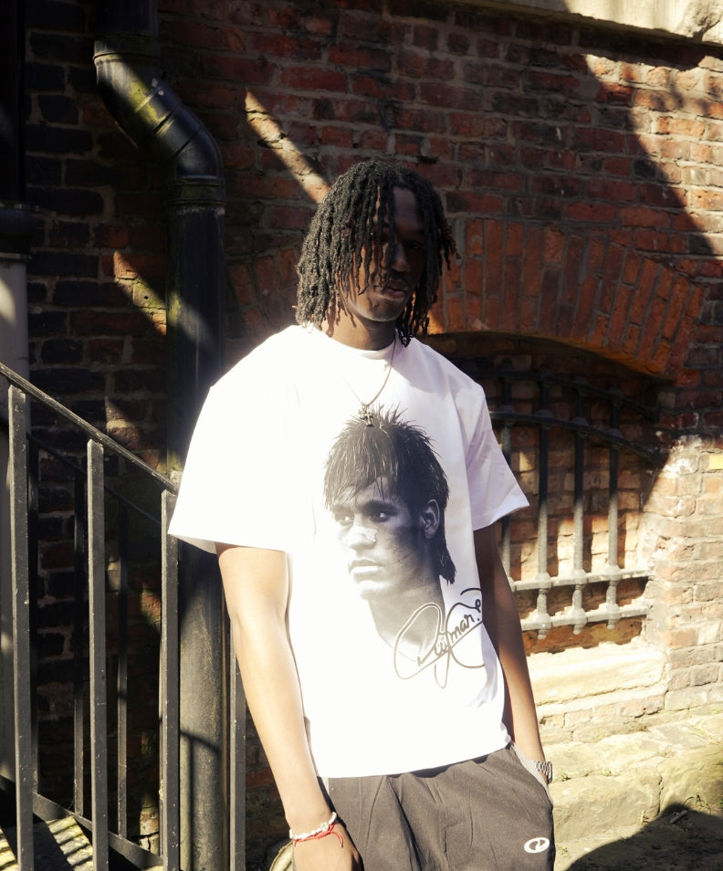 Monochrome Neymar portrait pops on crisp white fabric.