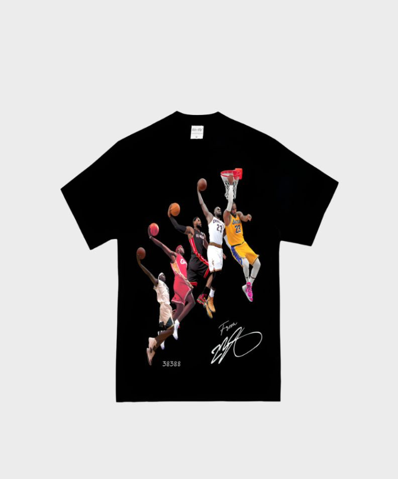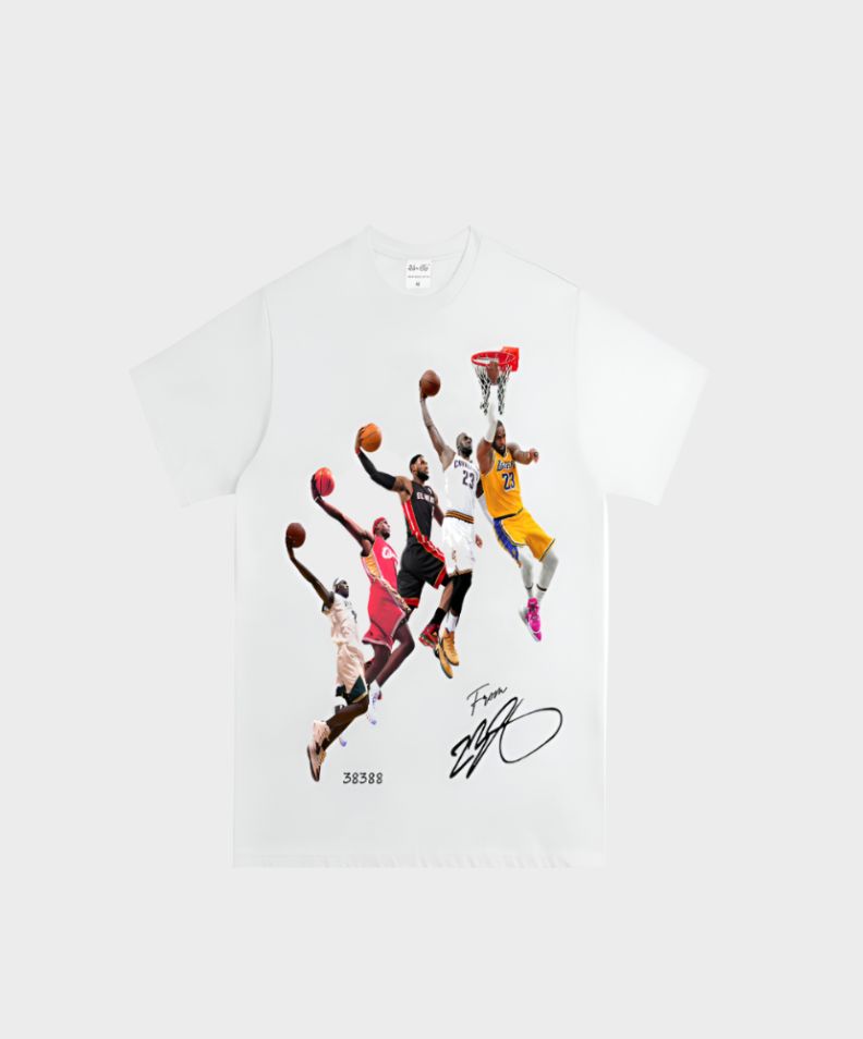 Celebrate a basketball legend with our DCRB Lebron Past and Present Dunks Tee. Featuring striking graphics of his iconic dunks across different eras, this shirt captures the evolution of a true sports icon. Crafted from a comfortable polyester-cotton blend, it delivers both breathable ease and bold style—perfect for game day or elevating your everyday streetwear.