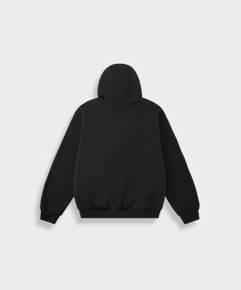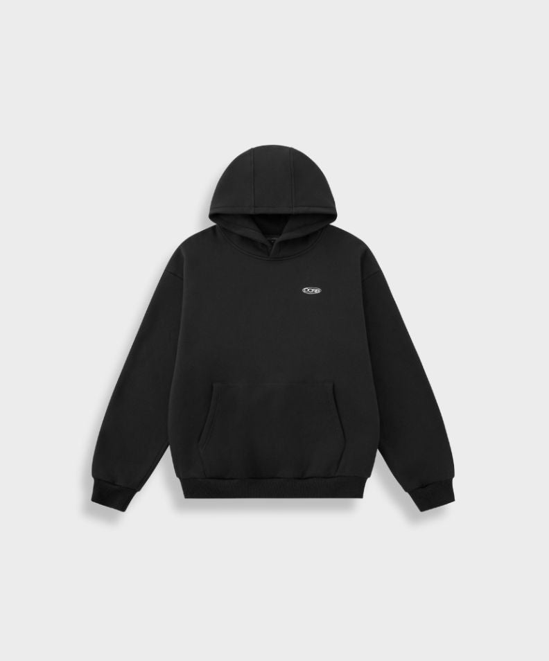 Oversized black hoodie with double-layer comfort and clean logo detail.